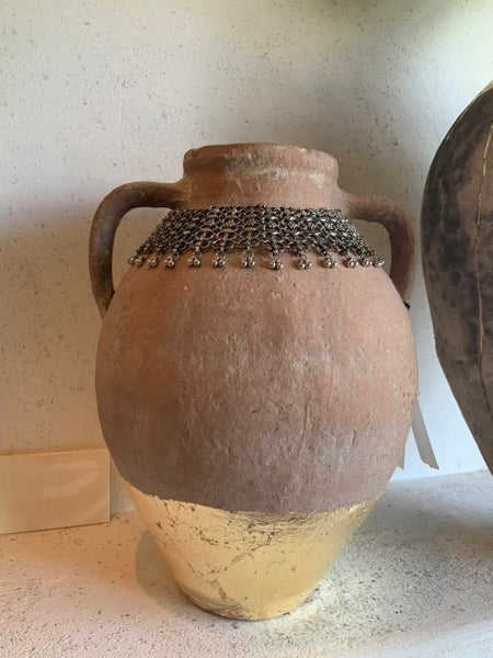 This vintage, terracotta vase has a sacred base in 24 Karat Gold. The Sacred Relics collection implements 24 karat gold application to the body of each vessel, elevating the individual character, or shape, making something once mundane into something sacred. This vase has the appropriate patina that honors its history. Hand-formed, this vase is unique in its details.  (15" x  9.5")